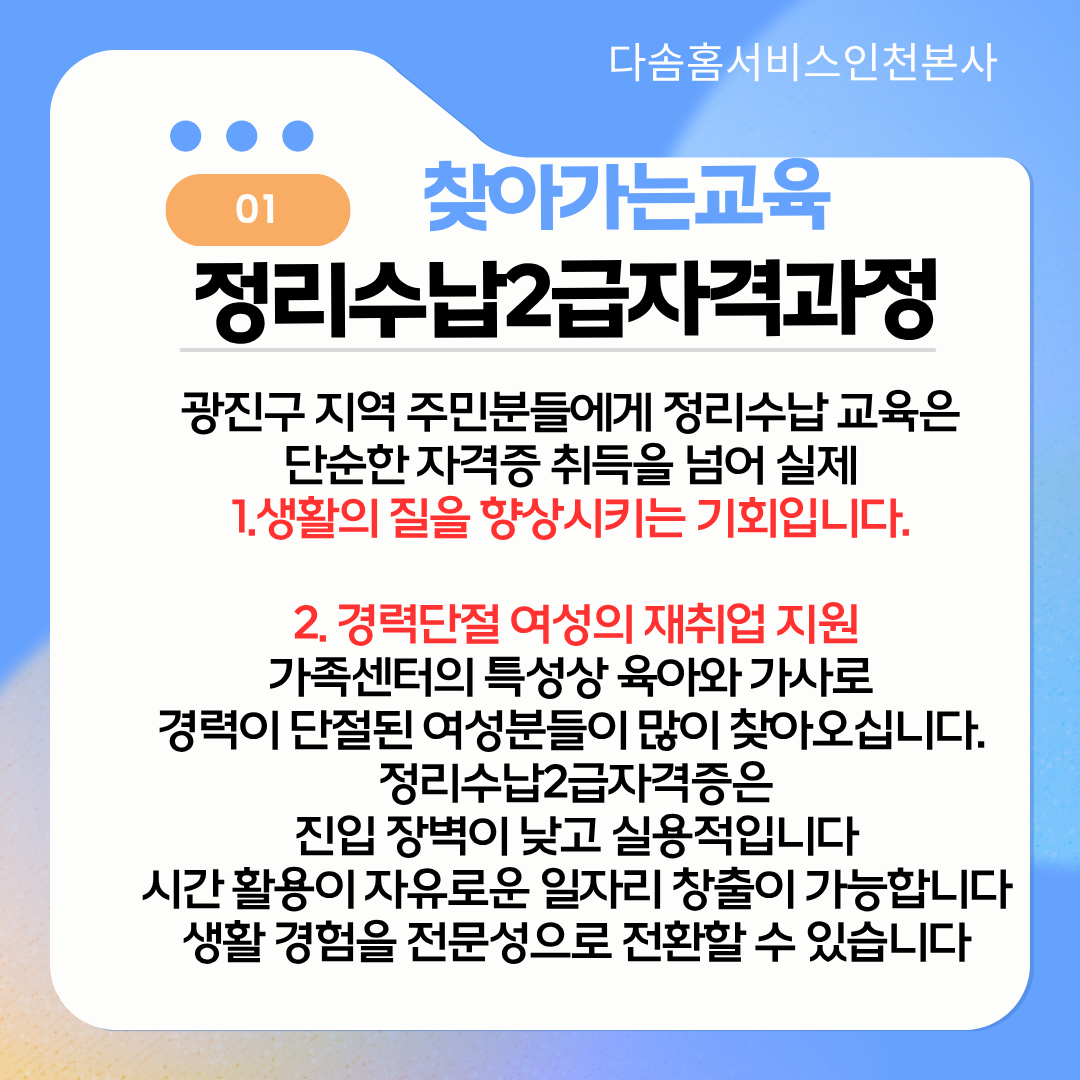 다솜홈서비스는 베이비시터, 가사전문가, 정리수납 전문가 취업을 연계한 교육프로그램을 운영하고 있습니다.