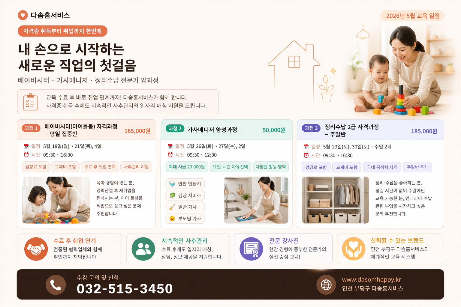 다솜홈서비스는 베이비시터, 수납컨설턴트, 가사전문가 양성을 위한 교육프로그램을 운영하고 있습니다.