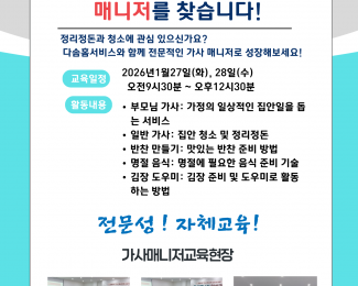 다솜홈서비스는 베이비시터, 가사전문가, 정리수납 전문가 취업을 연계한 교육프로그램을 운영하고 있습니다.
